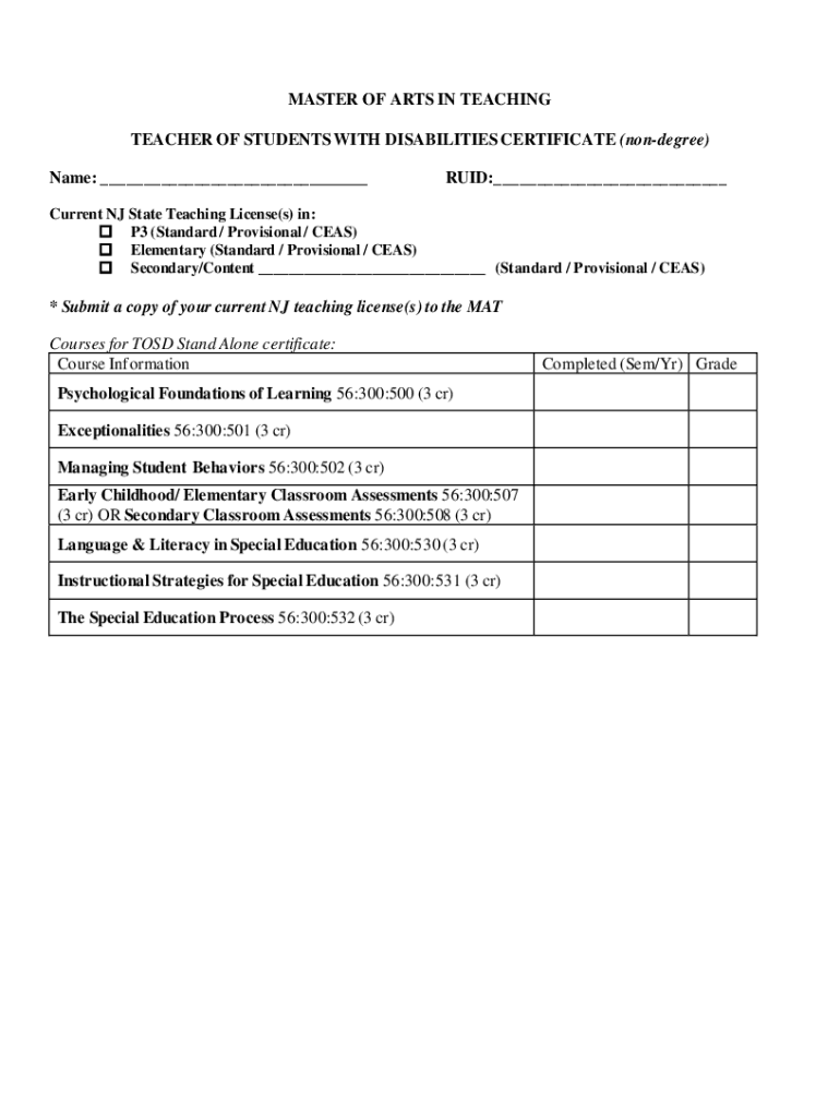 MASTER OF ARTS IN TEACHING TEACHER OF STUDENTS WITH DISABILITIES CERTIFICATE (nondegree) Name: ___RAID:___Current NJ State Teaching License(s) in: P3 (Standard / Provisional / CEASE) Elementary (Standard