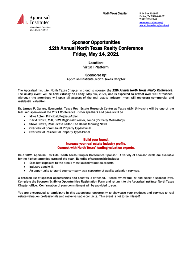 North Texas Chapter. O. Box 801807 Dallas, TX 753801807 T 9722332244 www.ainorthtexas.org ainorthtexas@sbcglobal.netSponsor Opportunities 12th Annual North Texas Realty Conference Friday, May 14,