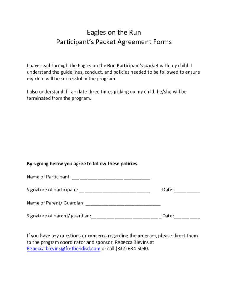 Eagles on the Run Participants Packet Agreement Forms I have read through the Eagles on the Run Participants packet with my child. I understand the guidelines, conduct, and policies needed to be followed
