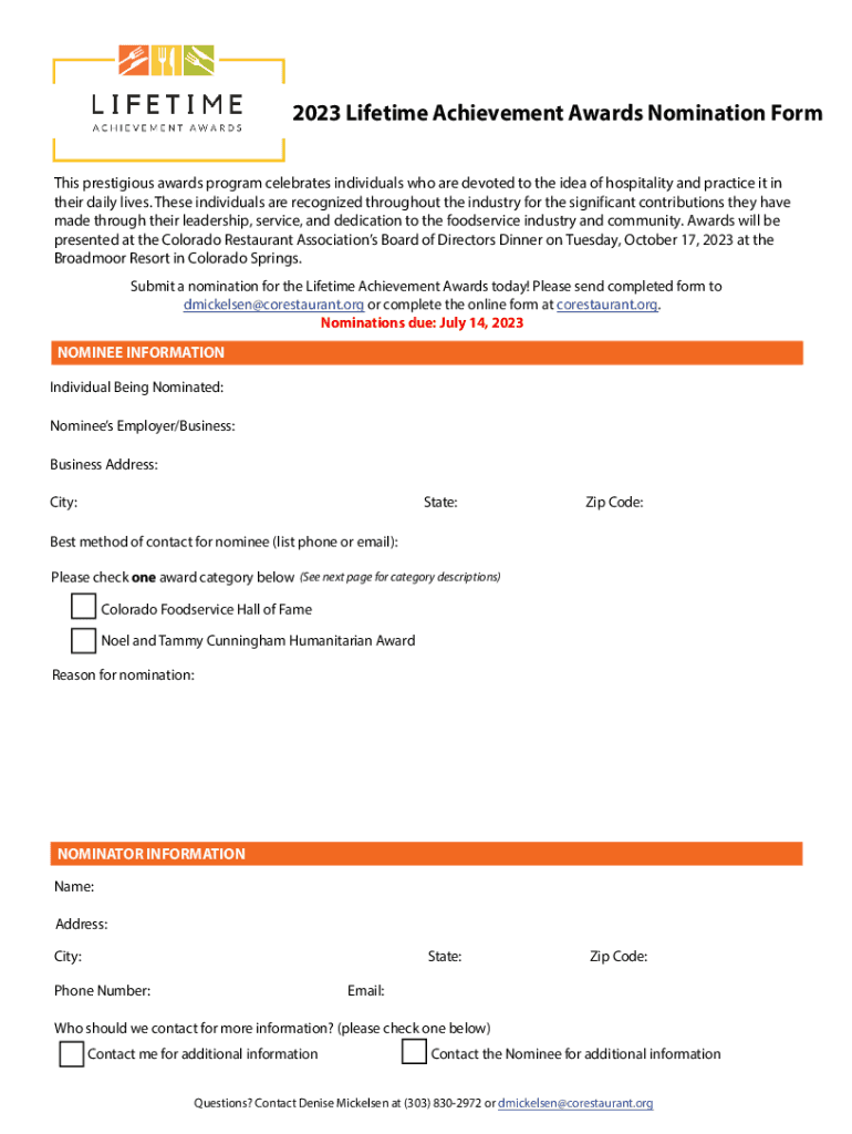 2023 Lifetime Achievement Awards Nomination Form This prestigious awards program celebrates individuals who are devoted to the idea of hospitality and practice it in their daily lives. These individuals