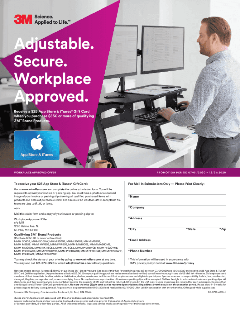 Adjustable. Secure. Workplace Approved. Receive a $25 App Store & iTunes Gift Card when you purchase $350 or more of qualifying 3M Brand Products. WORKPLACE APPROVED OFFER R O M O T I O N P E R I