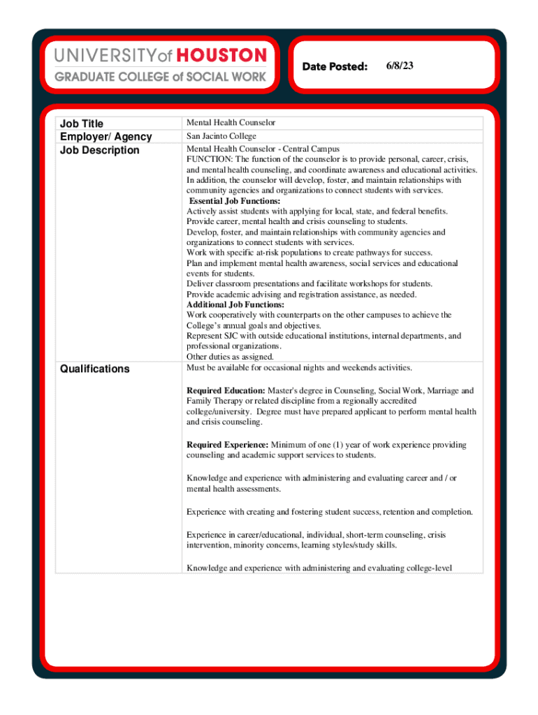 6/8/23Job Title Employer/ Agency Job DescriptionQualificationsMental Health Counselor San Jacinto College Mental Health Counselor Central Campus FUNCTION: The function of the counselor is to provide