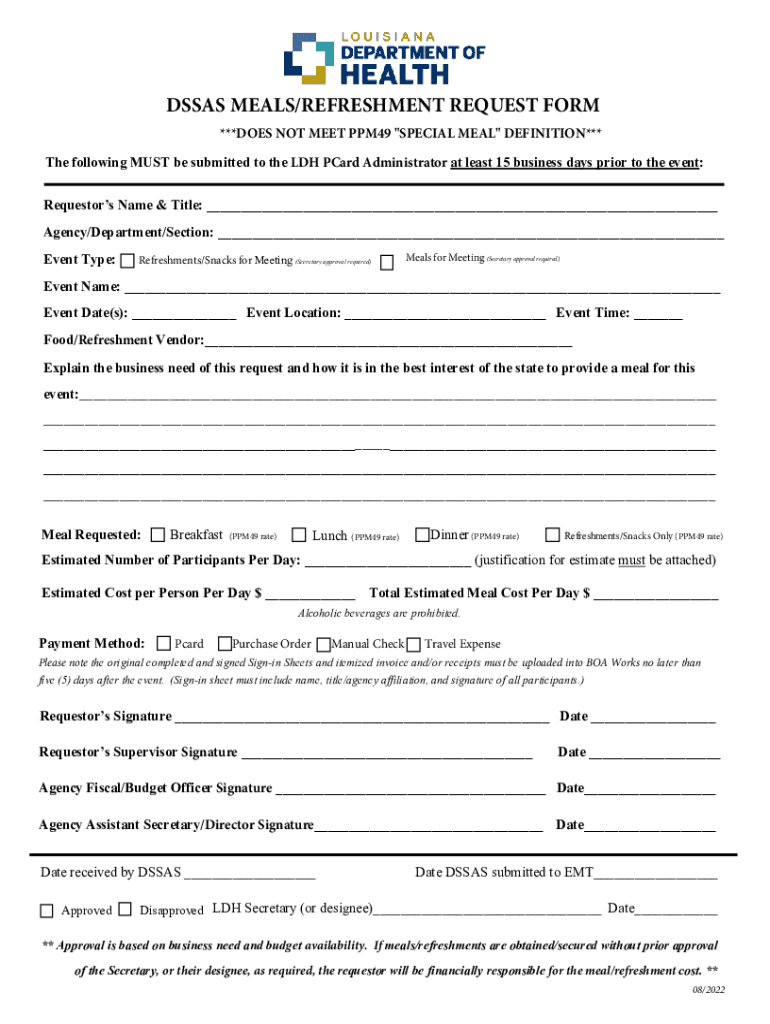 SSAS MEALS/REFRESHMENT REQUEST FORM ***DOES NOT MEET PPM49 \” SPECIAL MEAL\” DEFINITION***The following MUST be submitted to the LDH Card Administrator at least 15 business days prior to the event: