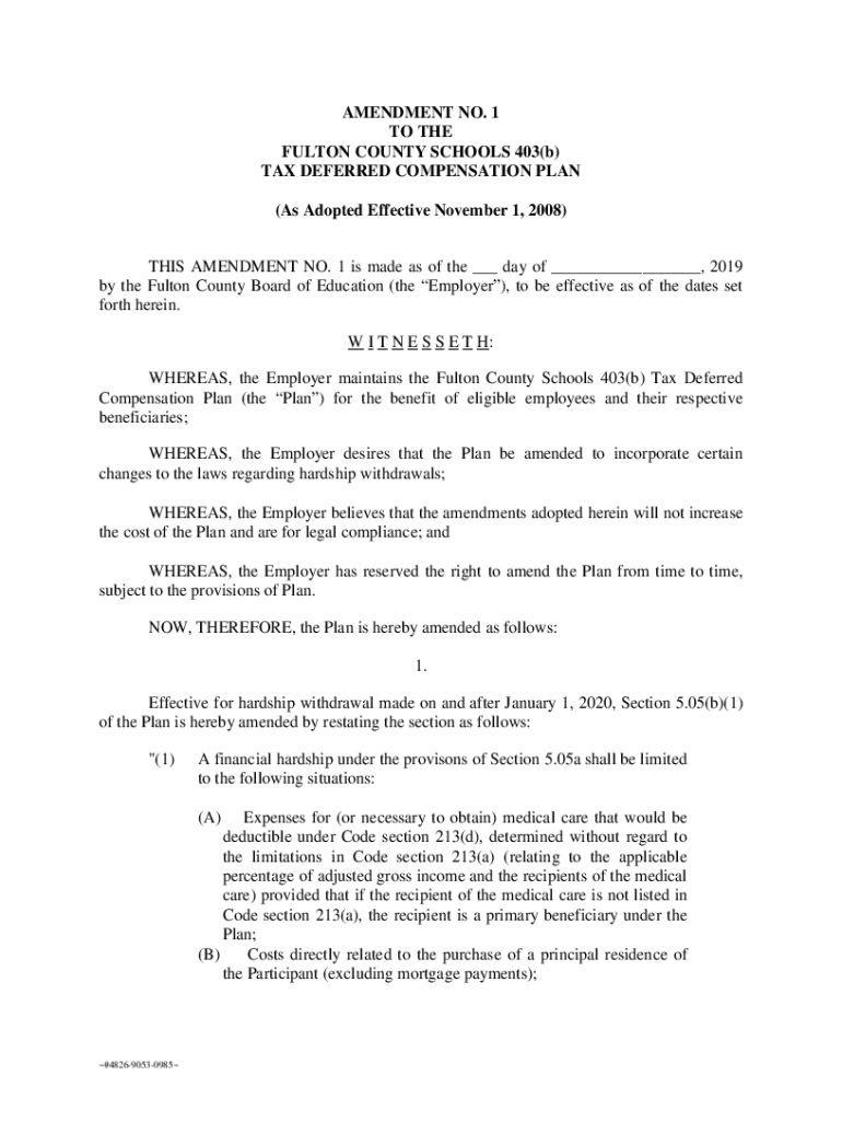 AMENDMENT NO. 1 TO THE FULTON COUNTY SCHOOLS 403(b) TAX DEFERRED COMPENSATION PLAN (As Adopted Effective November 1, 2008) THIS AMENDMENT NO. 1 is made as of the ___ day of ___, 2019 by the Fulton