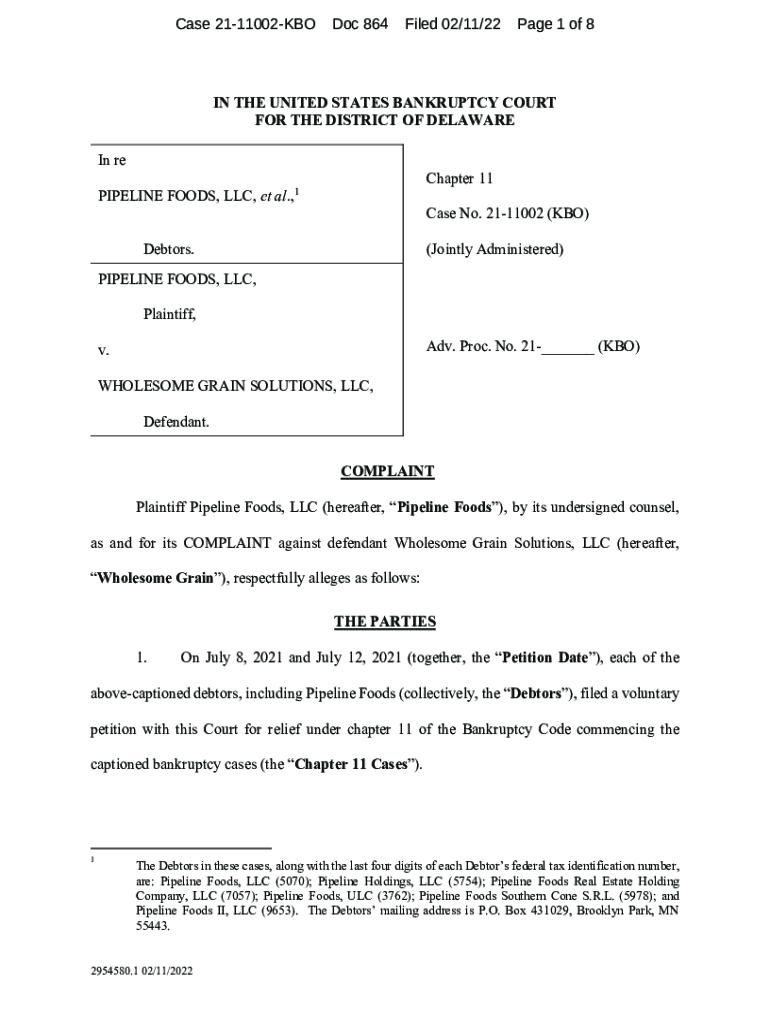 Case 2111002KBODoc 864Filed 02/11/22Page 1 of 8IN THE UNITED STATES BANKRUPTCY COURT FOR THE DISTRICT OF DELAWARE In re Chapter 11PIPELINE FOODS, LLC, et al.,1Case No. 2111002 (HBO) Debtors.(Jointly