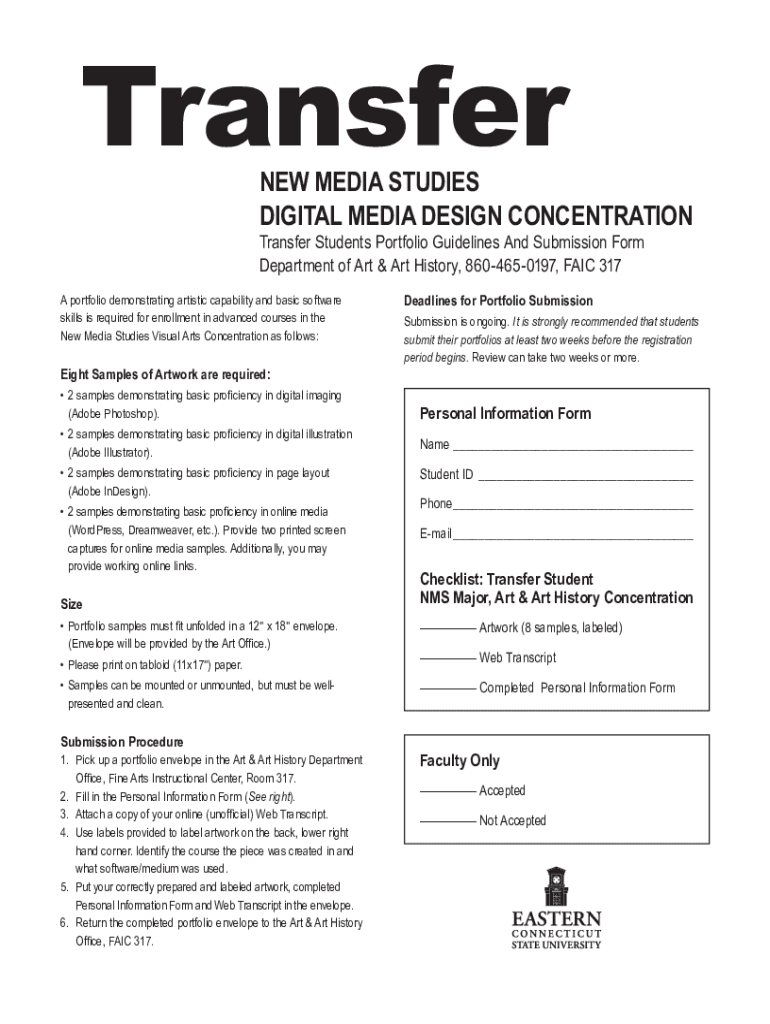 Transferred MEDIA STUDIES DIGITAL MEDIA DESIGN CONCENTRATION Transfer Students Portfolio Guidelines And Submission Form Department of Art & Art History, 8604650197, FAIR 317A portfolio demonstrating