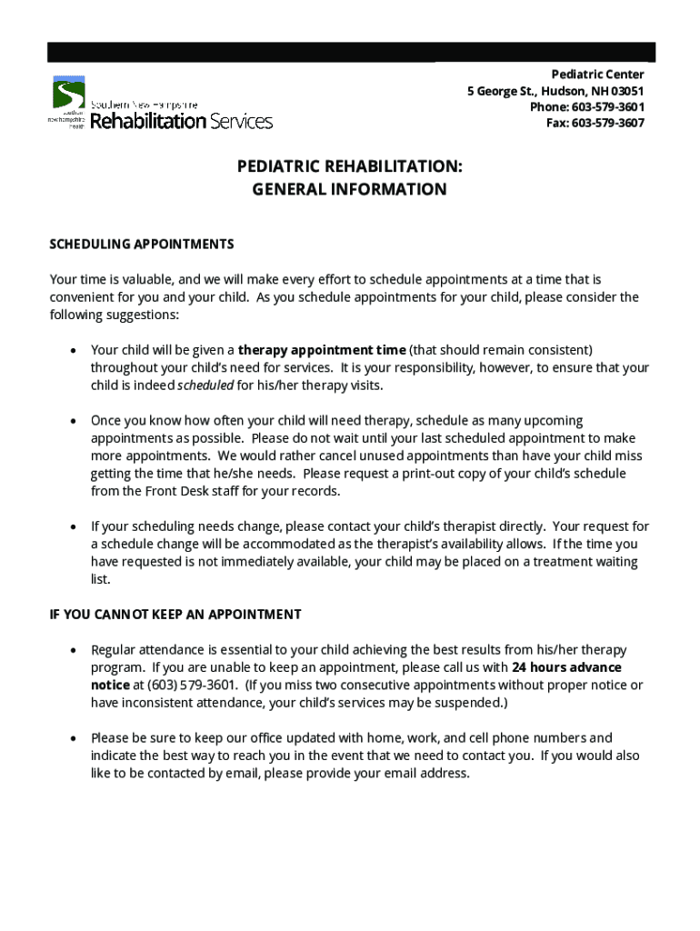 Pediatric Center 5 George St., Hudson, NH 03051 Phone: 6035793601 Fax: 6035793607PEDIATRIC REHABILITATION: GENERAL INFORMATION SCHEDULING APPOINTMENTS Your time is valuable, and we will make every