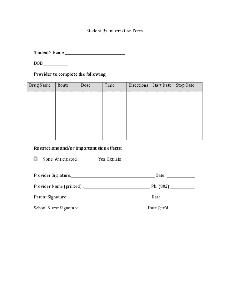 Student Rx Information FormStudents Name ___DOB ___Provider to complete the following:Drug NameRouteDoseTimeDirectionsStart Date Stop DateRestrictions and/or important side effects:NoneAnticipatedYes, Explain ___Provider Signature:___ Date: ___Provider Name (printed) :___ pH: (802) ___Parent Signature:___ Date: ___School Nurse Signature: ___ Date Recd:___
