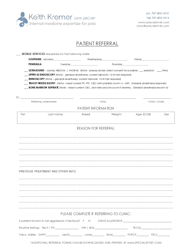 Get the free Online Referral FormVirginia Veterinary Specialists