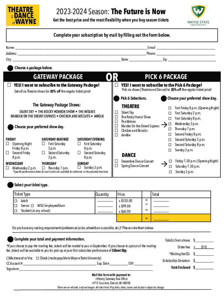 20232024 Season: The Future is Forgotten the best price and the most flexibility when you buy season ticketsComplete your subscription by mail by filling out the form below. Name: ___ Email: ___ Address: