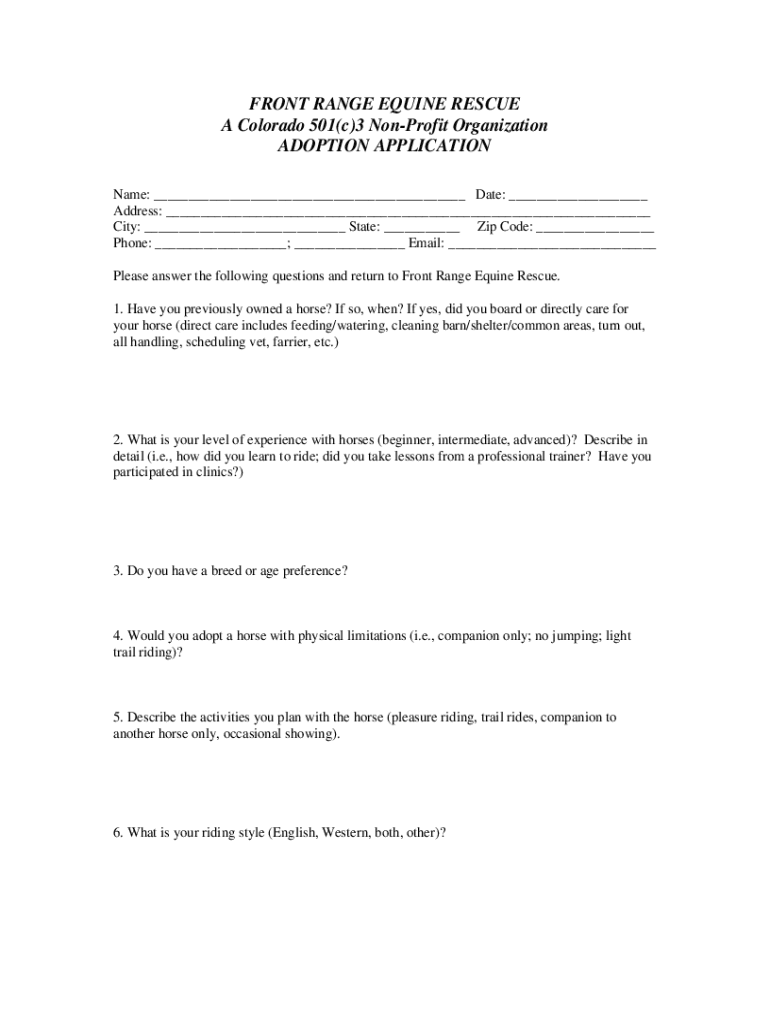 FRONT RANGE EQUINE RESCUE A Colorado 501(c)3 Nonprofit Organization ADOPTION APPLICATION Name: ___ Date: ___ Address: ___ City: ___ State: ___ Zip Code: ___ Phone: ___; ___ Email: ___ Please answer