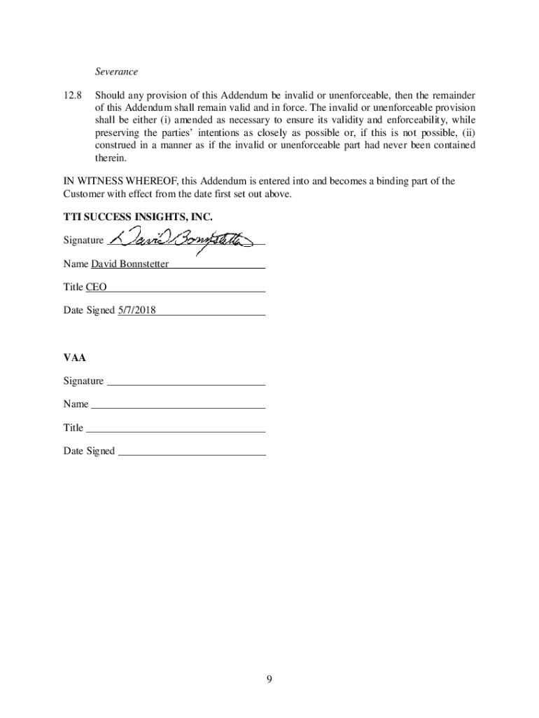 DATA PROTECTION ADDENDUM This Data Protection Addendum (Addendum) forms part of the Customer Agreement (Customer Agreement) between: (i) TTI Success Insights, Inc. (TTI Success Insights) and (ii)