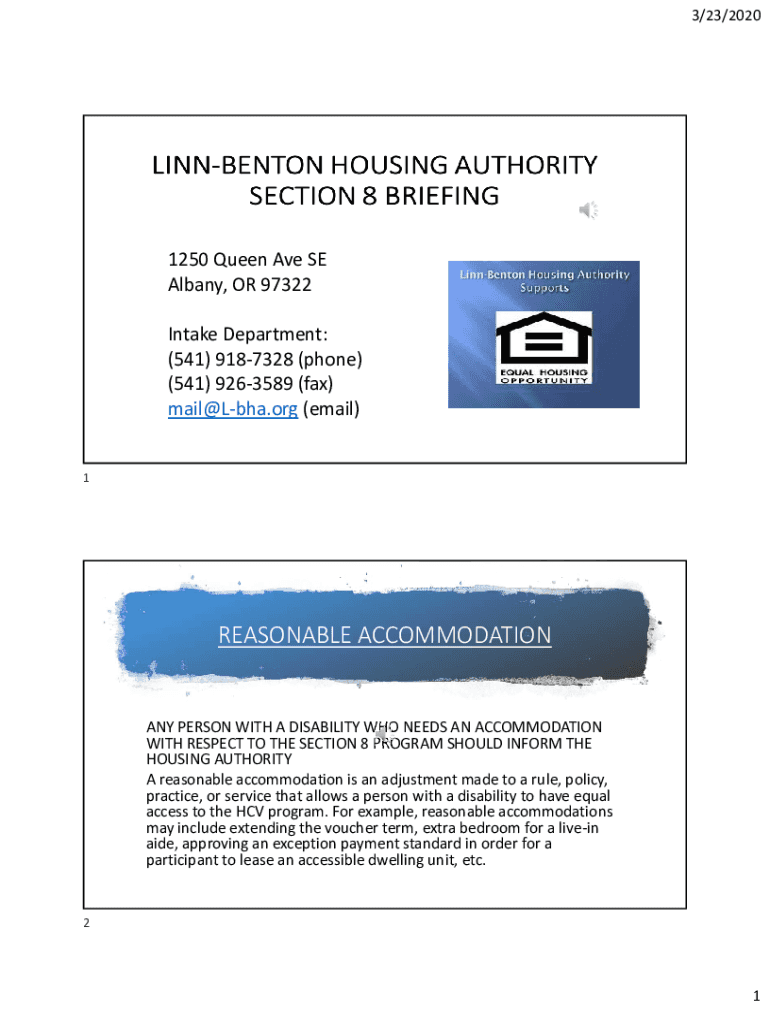 3/23/20201250QueenAveSE Albany,OR97322 IntakeDepartment: (541)9187328(phone) (541)9263589(fax) mail@Lbha.org (email) 1REASONABLEACCOMMODATIONANYPERSONWITHADISABILITYWHONEEDSANACCOMMODATION WITHRESPECTTOTHESECTION8PROGRAMSHOULDINFORMTHE