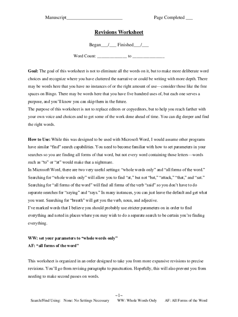 Manuscript___Page Completed ___Revisions Worksheet Began___/___ Finished___/___ Word Count: ___ to ___Goal: The goal of this worksheet is not to eliminate all the words on it, but to make more deliberate
