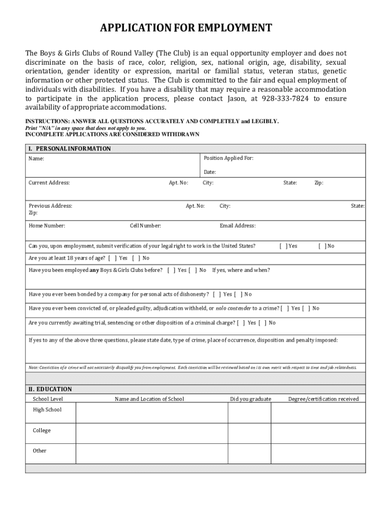 APPLICATION FOR EMPLOYMENT The Boys & Girls Clubs of Round Valley (The Club) is an equal opportunity employer and does not discriminate on the basis of race, color, religion, sex, national origin,