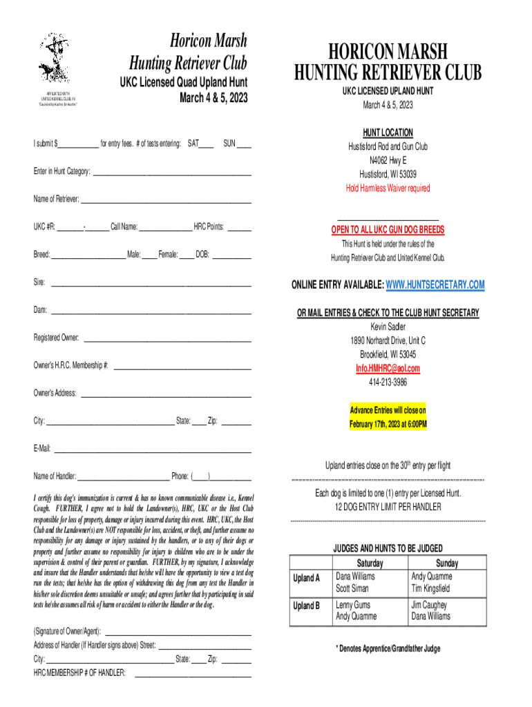 Horizon Marsh Hunting Retriever Club UK Licensed Quad Upland Hunt March 4 & 5, 2023AFFILIATED WITH UNITED KENNEL CLUB, IN \” Conceived by Hunters for Hunters\” I submit $___ for entry fees. #