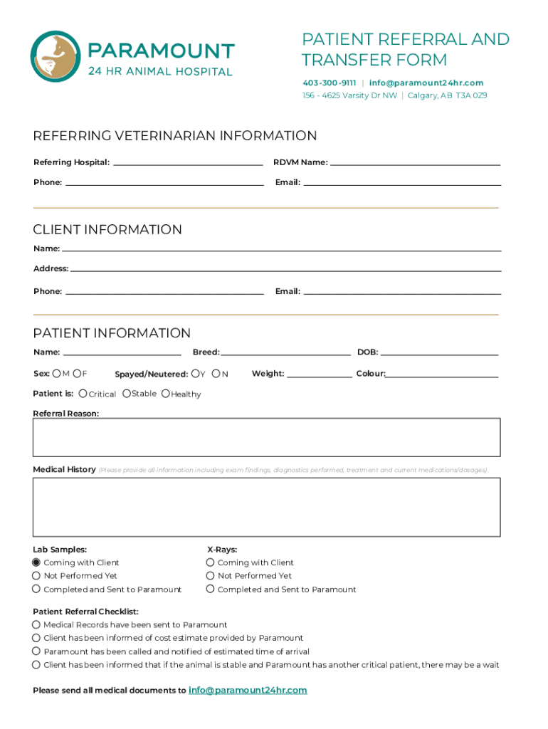 PATIENT REFERRAL AND TRANSFER FORM 4033009111 | info@paramount24hr.com 156 4625 Varsity Dr NW | Calgary, AB T3A 0Z9REFERRING VETERINARIAN INFORMATION Referring Hospital:RDM Name:Phone:Email:CLIENT