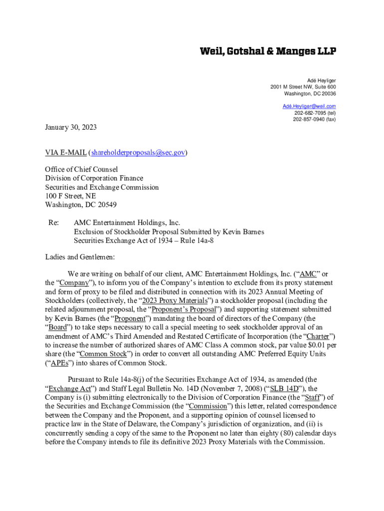 Get the free AMC Entertainment Holdings, Inc.; Rule 14a-8 no-action letter