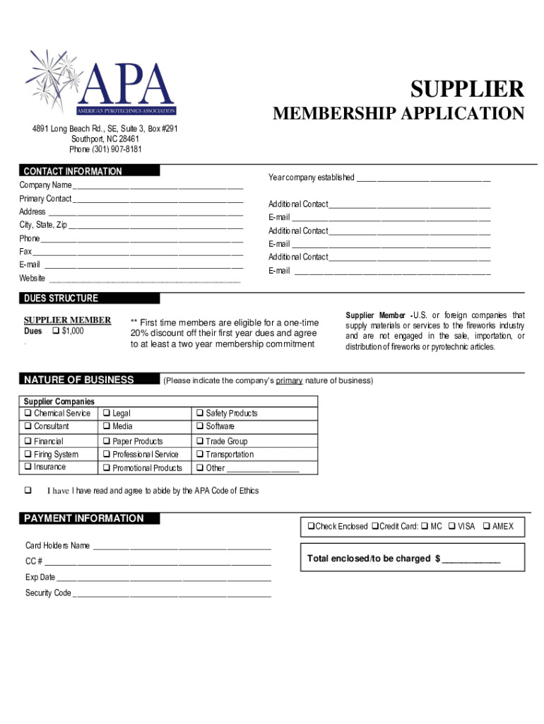 SUPPLIER MEMBERSHIP APPLICATION4891 Long Beach Rd., SE, Suite 3, Box #291 Southport, NC 28461 Phone (301) 9078181CONTACT INFORMATION Company Name ___ Primary Contact ___ Address ___ City, State, Zip