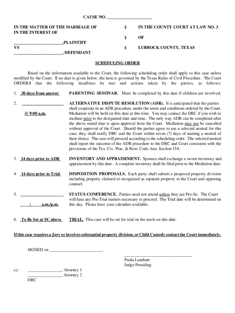 CAUSE NO. ___ IN THE MATTER OF THE MARRIAGE OF IN THE INTEREST OF ___, PLAINTIFF VS ___, DEFENDANT IN THE COUNTY COURT AT LAW NO. 3OFLUBBOCK COUNTY, TEXASSCHEDULING ORDER Based on the information