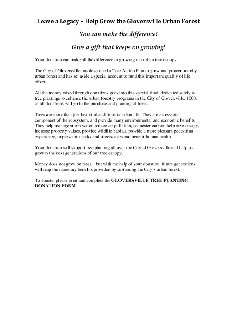 Leave a Legacy Help Grow the Gloversville Urban Forest You can make the difference! Give a gift that keeps on growing! Your donation can make all the difference in growing our urban tree canopy. The