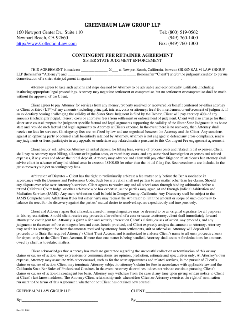 GREENBACK LAW GROUP LLP 160 Newport Center Dr., Suite 110 Newport Beach, CA 92660 http://www.CollectionLaw.comTel: (800) 5190562 (949) 7601400 Fax: (949) 7601300CONTINGENT FEE RETAINER AGREEMENT SISTER
