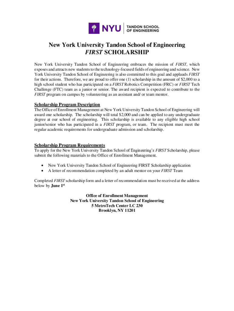 New York University Tendon School of Engineering FIRST SCHOLARSHIP New York University Tendon School of Engineering embraces the mission of FIRST, which exposes and attracts new students to the technology