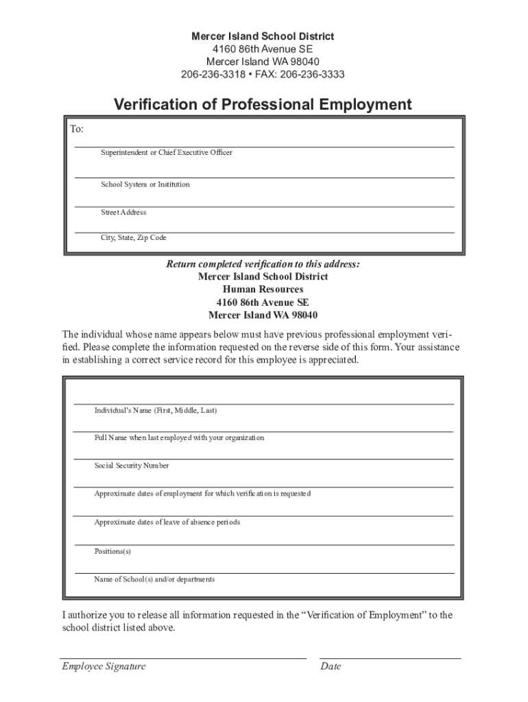 Mercer Island School District 4160 86th Avenue SE Mercer Island WA 98040 2062363318 Faxes: 2062363333Verification of Professional Employment To:Superintendent or Chief Executive OfficerSchool System
