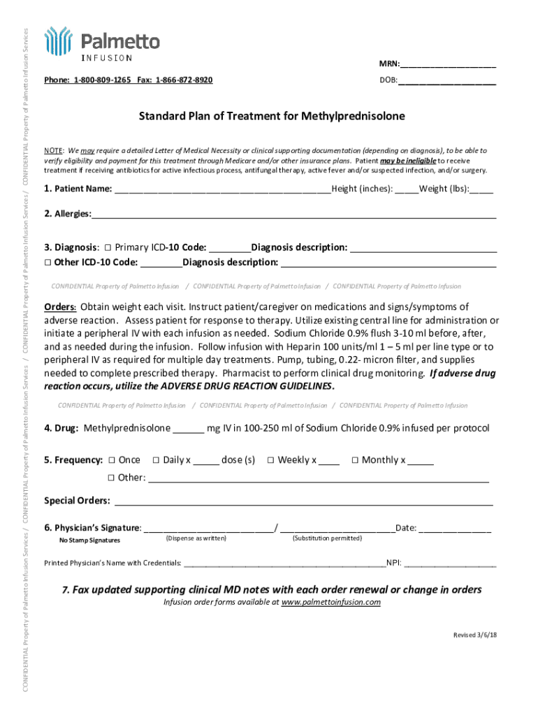 CONFIDENTIALPropertyofPalmettoInfusionServices/CONFIDENTIALPropertyofPalmettoInfusionServices/CONFIDENTIALPropertyofPalmettoInfusionServices/CONFIDENTIALPropertyofPalmettoInfusionServicesMRN:___ DOB:___Phone:18008091265Fax:18668728920StandardPlanofTreatmentforMethylprednisolone