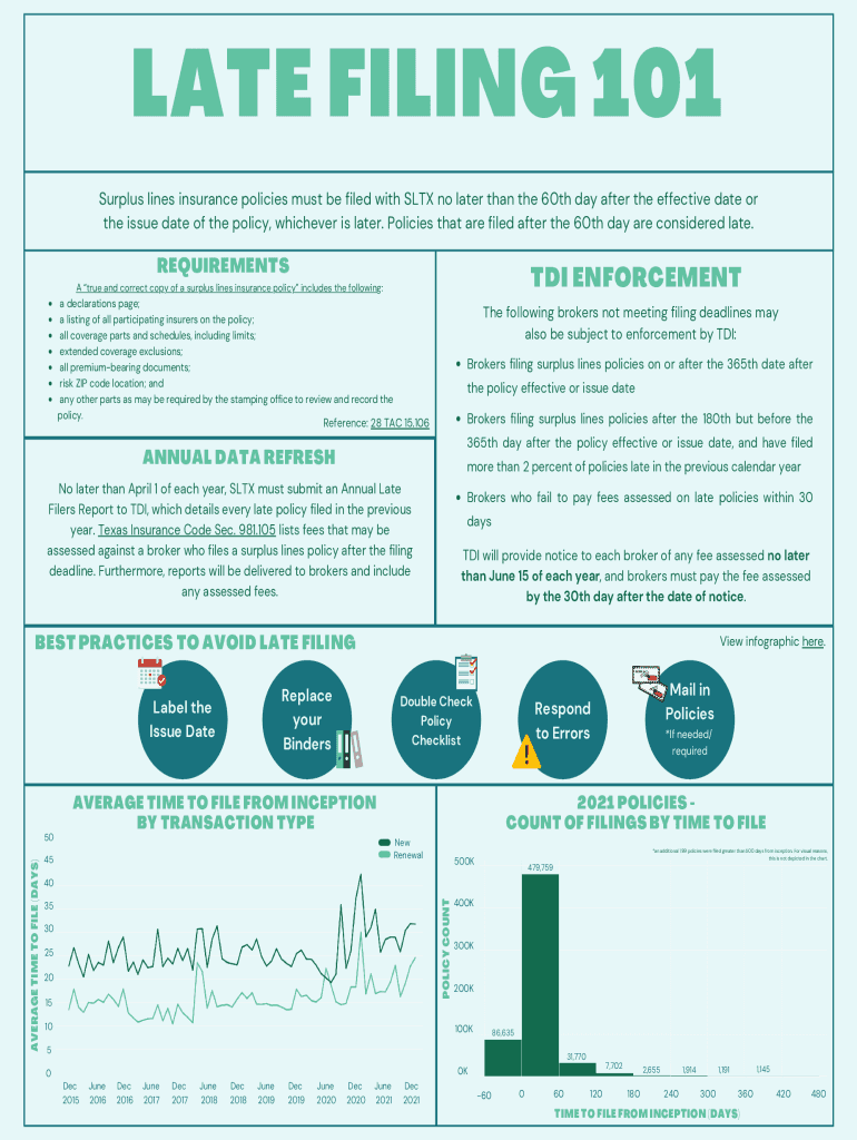 LATE FILING 101 Surplus lines insurance policies must be filed with SLT no later than the 60th day after the effective date or the issue date of the policy, whichever is later. Policies that are filed