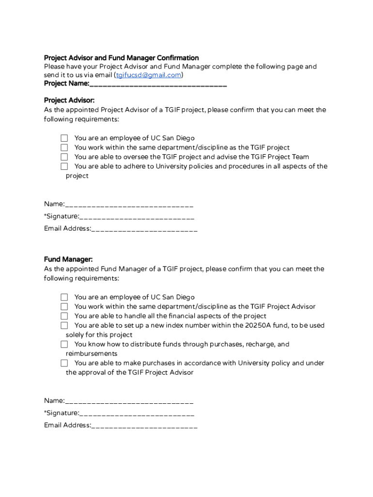 Project Advisor and Fund Manager Confirmation Please have your Project Advisor and Fund Manager complete the following page and send it to us via email (tgifucsd@gmail.com) Project Name:___ Project