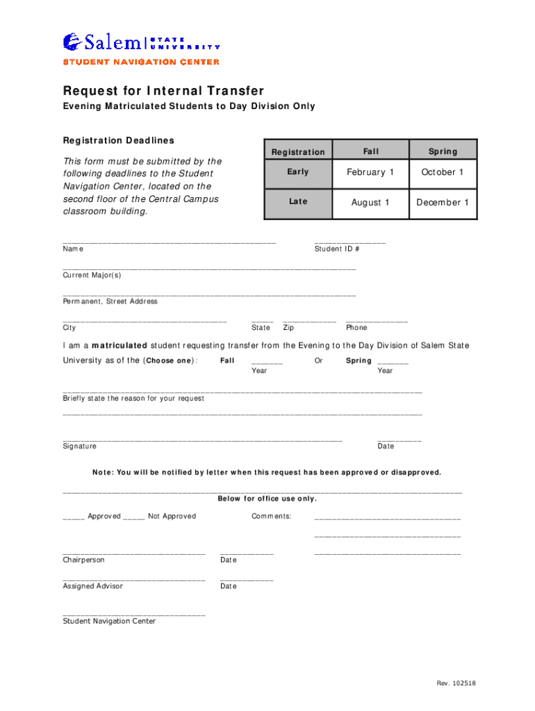 Request for Internal Transfer Evening Matriculated Students to Day Division Only Registration Deadlines This form must be submitted by the following deadlines to the Student Navigation Center, located