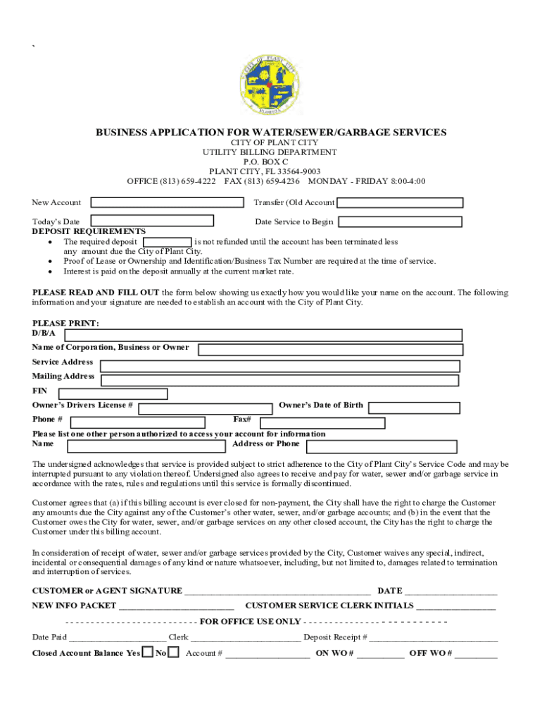 `BUSINESS APPLICATION FOR WATER/SEWER/GARBAGE SERVICES CITY OF PLANT CITY UTILITY BILLING DEPARTMENT P.O. BOX C PLANT CITY, FL 335649003 OFFICE (813) 6594222 FAX (813) 6594236 MONDAY FRIDAY 8:004:00New