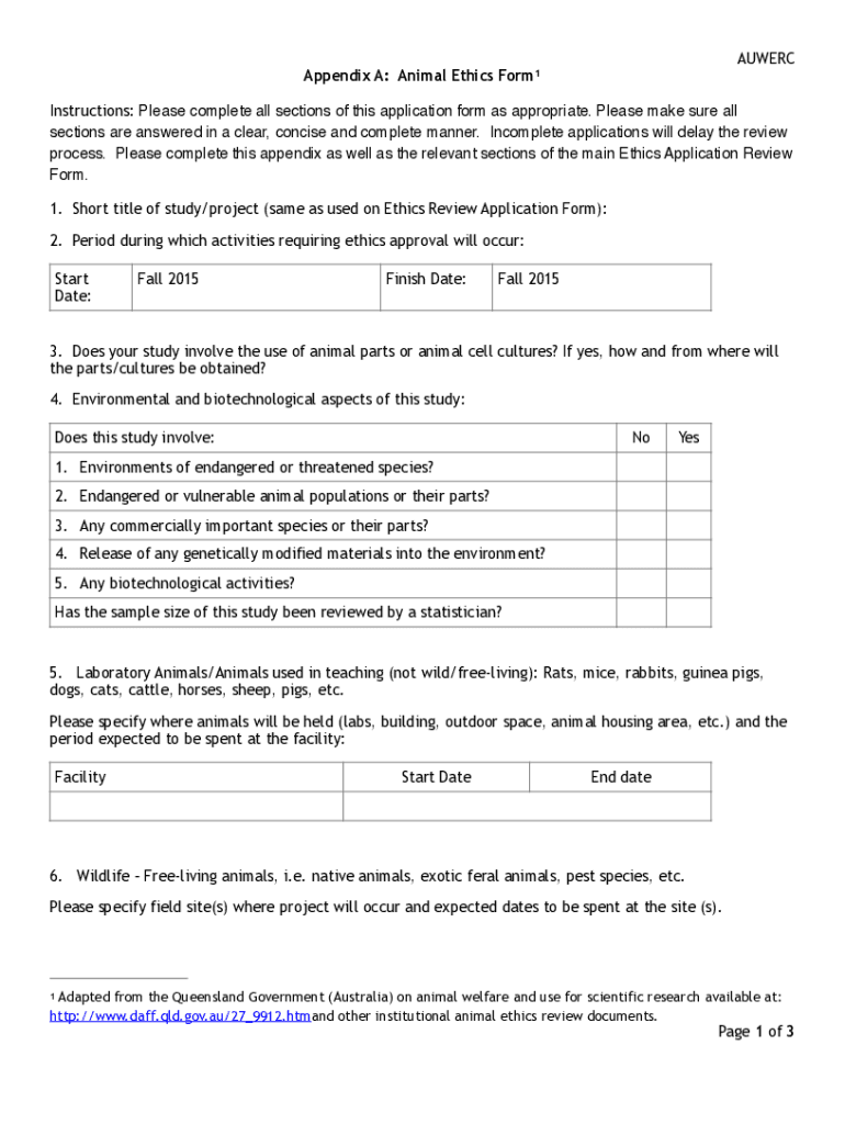 AUWERCAppendix A: Animal Ethics Form1Instructions: Please complete all sections of this application form as appropriate. Please make sure all sections are answered in a clear, concise and complete