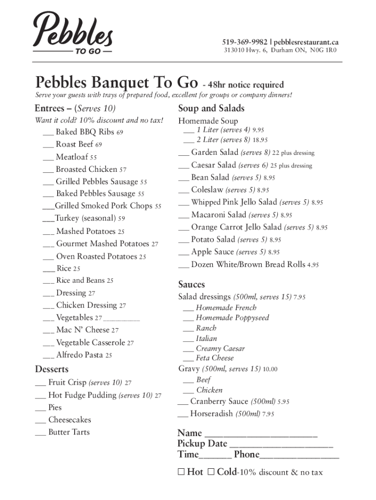 5193699982 | pebbles restaurant.ca 313010 Hwy. 6, Durham ON, N0G 1R0Pebbles Banquet To Go 48hr notice requiredServe your guests with trays of prepared food, excellent for groups or company dinners!