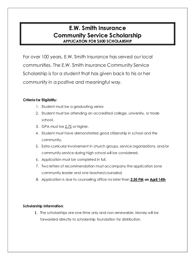 E.W. Smith Insurance Community Service Scholarship APPLICATION FOR $500 Scholarship over 100 years, E.W. Smith Insurance has served our local communities. The E.W. Smith Insurance Community Service