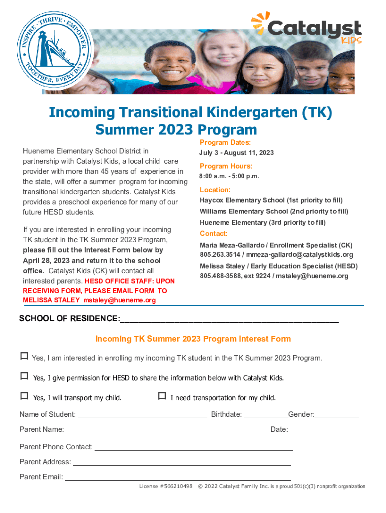 Incoming Transitional Kindergarten (TK) Summer 2023 Program Hence Elementary School District in partnership with Catalyst Kids, a local child care provider with more than 45 years of experience in