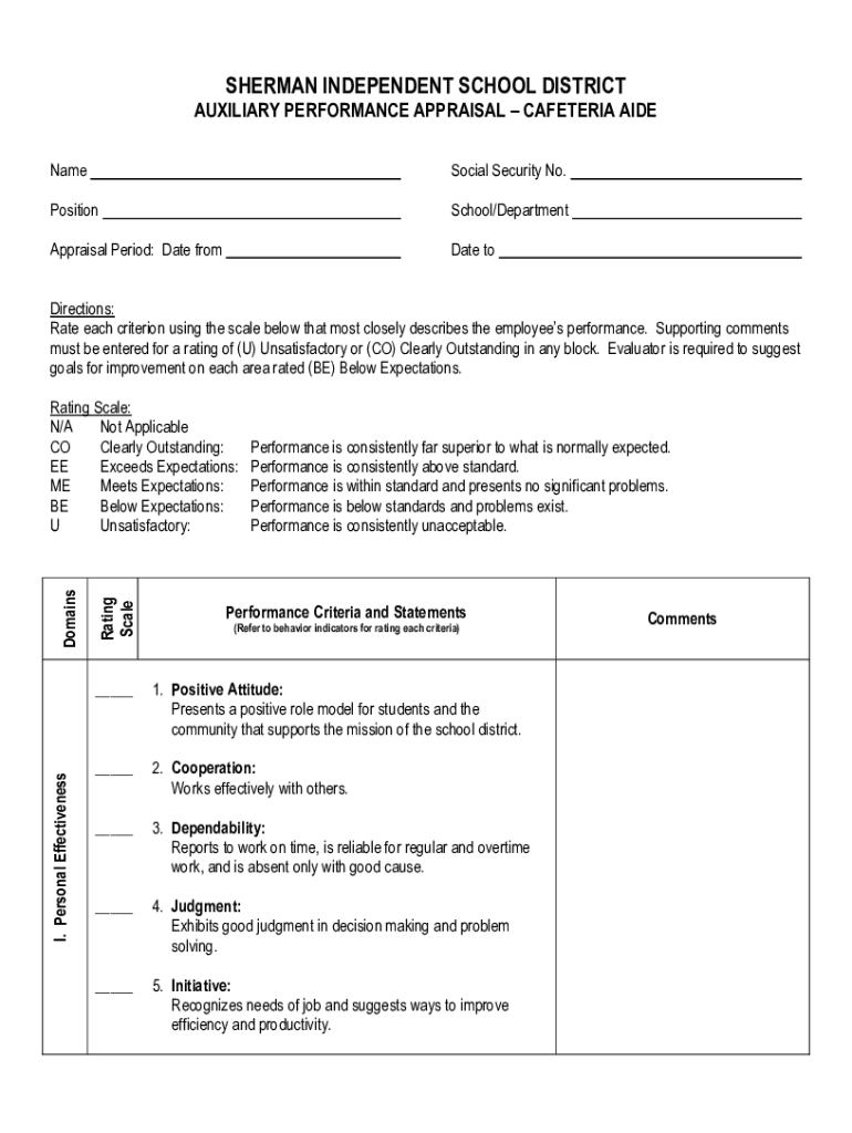 SHERMAN INDEPENDENT SCHOOL DISTRICT AUXILIARY PERFORMANCE APPRAISAL CAFETERIA AIDE Asocial Security No. PositionSchool/DepartmentAppraisal Period: Date bromate directions: Rate each criterion using