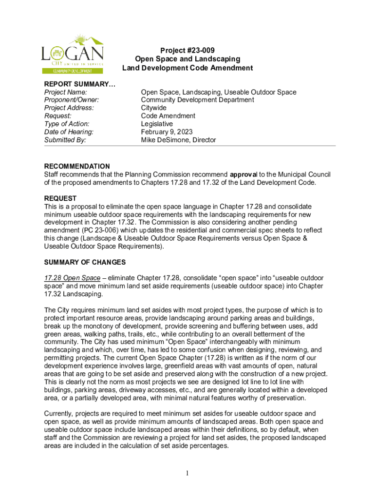 Project #23009 Open Space and Landscaping Land Development Code Amendment REPORT SUMMARY Project Name: Proponent/Owner: Project Address: Request: Type of Action: Date of Hearing: Submitted By:Open