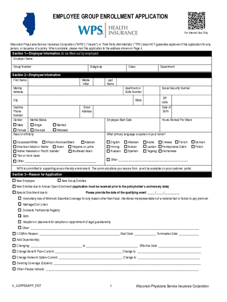 EMPLOYEE GROUP ENROLLMENT APPLICATION For Internal Use Only Wisconsin Physicians Service Insurance Corporation (WPS) (Insurer) or ThirdParty Administrator (TPA) does NOT guarantee approval of this