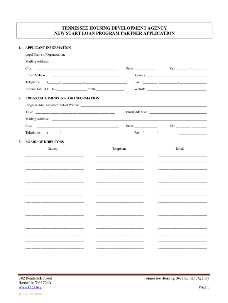 TENNESSEE HOUSING DEVELOPMENT AGENCY NEW START LOAN PROGRAM PARTNER APPLICATION 1.APPLICANT INFORMATION Legal Name of Organization: Mailing Address: City:___Email Address: Telephone:State: ___County: