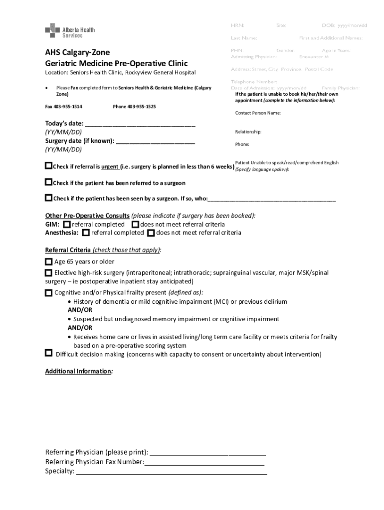 Please Fax completed form to Seniors Health & Geriatric Medicine (Calgary