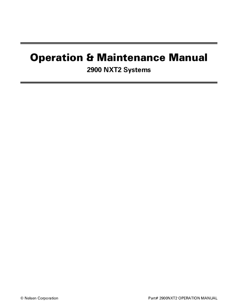 Operation & Maintenance Manual 2900 NXT2 Systems Nelsen CorporationPart# 2900NXT2 OPERATION Manageable of Contents 1INTRODUCTION2 PRINCIPLES of ION EXCHANGE 2.1Ion Exchange Softening Process 2.2Quality