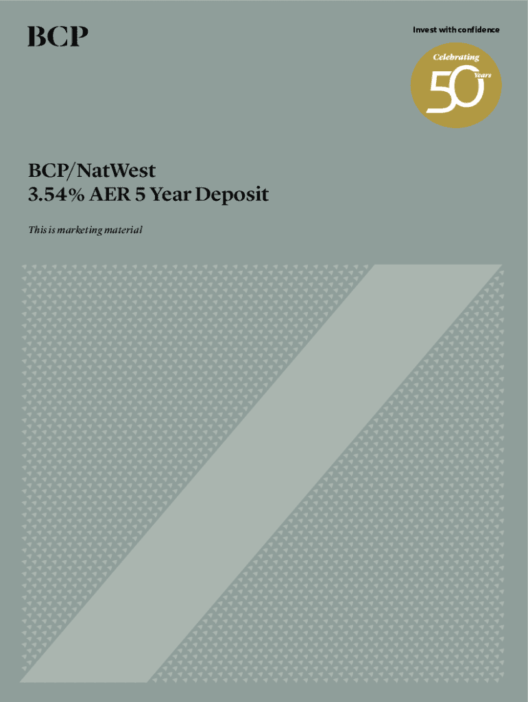 Invest with confidence BCP/Nat West 3.54% AER 5 Year Deposit This is marketing materialOVERVIEW 4.0% Fixed Deposit Interest paid out at the end of years 1 to 3 2.8% Fixed Deposit Interest paid out