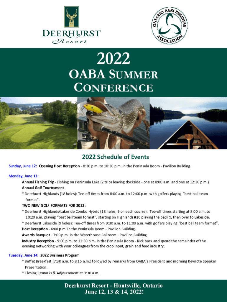 2022OABA SUMMER CONFERENCE2022 Schedule of Events Sunday, June 12: Opening Host Reception 8:30 p.m. to 10:30 p.m. in the Peninsula Room Pavilion Building. Monday, June 13: Annual Fishing Trip Fishing