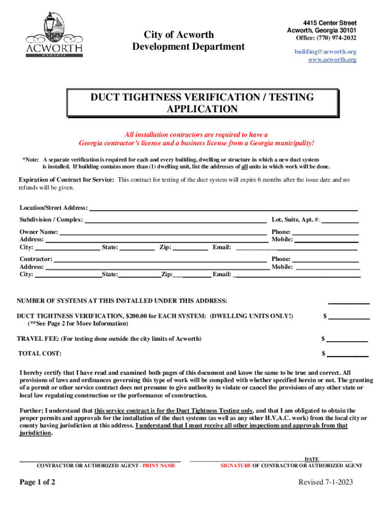 City of Ac worth Development Department4415 Center Street Ac worth, Georgia 30101 Office: (770) 9742032 building@acworth.org www.acworth.orgDUCT TIGHTNESS VERIFICATION / TESTING APPLICATION All installation