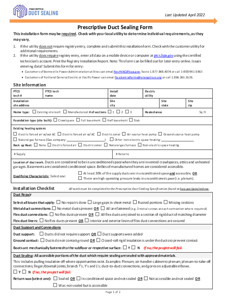 Last Updated April 2022Prescriptive Duct Sealing Forms installation form may be required. Check with your local utility to determine individual requirements, as they may vary. 1. If the utility does
