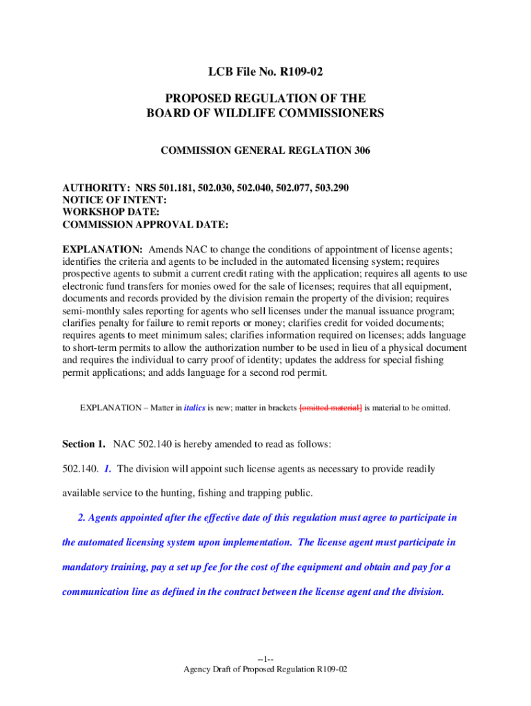 LAB File No. R10902 PROPOSED REGULATION OF THE BOARD OF WILDLIFE COMMISSIONERS COMMISSION GENERAL REGULATION 306AUTHORITY: NRS 501.181, 502.030, 502.040, 502.077, 503.290 NOTICE OF INTENT: WORKSHOP