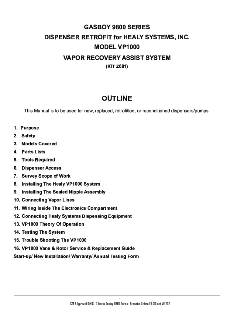 GABON 9800 SERIES DISPENSER RETROFIT for HEAVY SYSTEMS, INC. MODEL VP1000 VAPOR RECOVERY ASSIST SYSTEM (KIT Z081)OUTLINE This Manual is to be used for new, replaced, retrofitted, or reconditioned