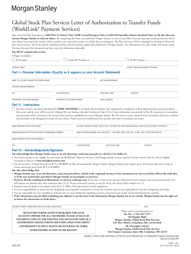 Save Draftier FormGlobal Stock Plan Services Letter of Authorization to Transfer Funds (Worldlier Payment Services) Sign and return this form prior to 4:00 PM U.S. Eastern Time (22:00 Central European